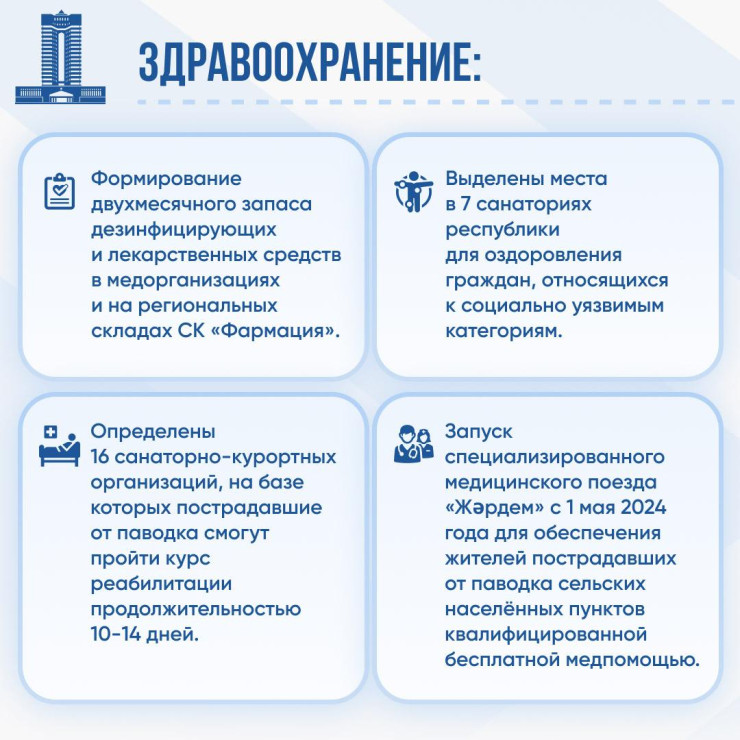 - с 1 мая будет запущен специализированный медицинский поезд "Жәрдем" для обеспечения жителей квалифицированной бесплатной медицинской помощью. С учетом паводковой ситуации услугами медпоезда будут охвачены жители пострадавших сельских населенных пунктов.