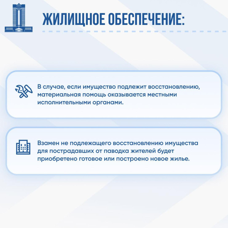 - пострадавшие от паводков могут рассчитывать на приобретение готового или строительство нового жилья взамен разрушенного (необходимо обратиться в акимат);