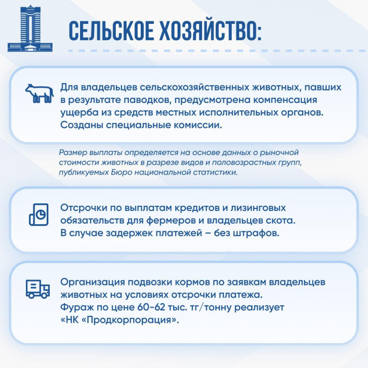 - правительством дополнительно будет оказано содействие фермерам и владельцам скота в виде отсрочки по выплатам кредитов и лизинговых обязательств. В случае задержки выплат штрафы им начисляться не будут;