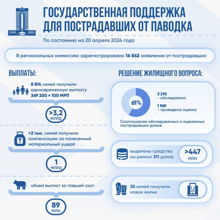 "По состоянию на 20 апреля текущего года единовременную выплату в размере 100 МРП (369 200 тенге в 2024 году) получили 8 814 семей на сумму около 3,2 миллиарда тенге. Более 2 тысяч семей получили компенсацию за понесенный материальный ущерб почти на 1 миллиард тенге. Объем выплат за павший скот достиг 89 миллионов тенге.