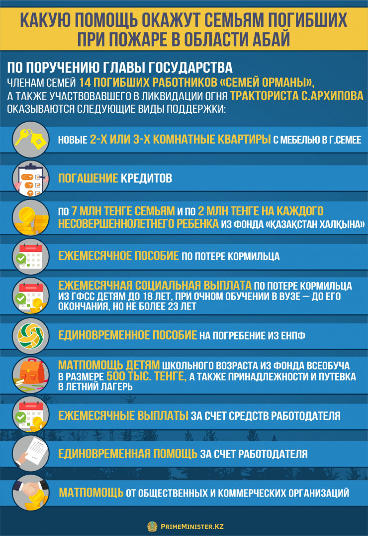 - материальная помощь из средств фонда "Қазақстан халқына" в размере 7 миллионов тенге семье и по 2 миллиона на каждого несовершеннолетнего ребенка, общая сумма выплат составит 127 миллионов тенге (по состоянию на 15 июня);