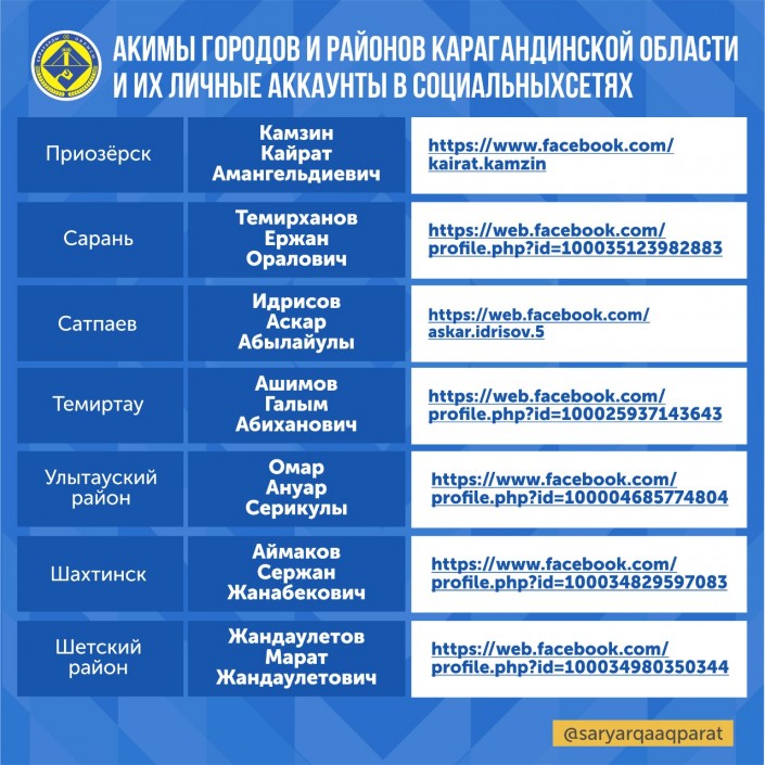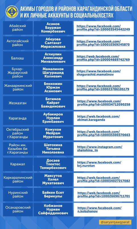 Акимы всех городов и районов Карагандинской области общаются с жителями напрямую через социальные сети. В специальной инфографике для удобства граждан собраны все адреса личных страниц руководителей городов и районов Карагандинской области.