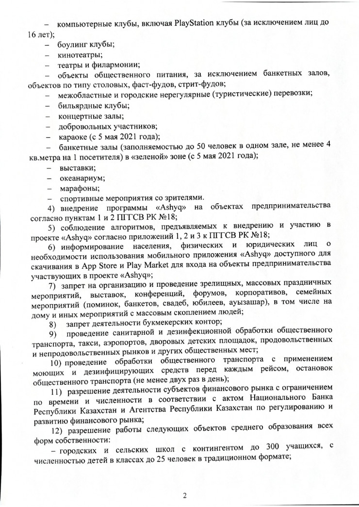 объекты общественного питания (за исключением банкетных залов и объектов по типу столовых, фаст-фудов и стрит-фудов), межобластные и городские нерегулярные (туристические) перевозки, бильярдные клубы, концертные залы, добровольные участники, караоке (с 5 мая), банкетные залы (с 5 мая), выставки, океанариум, марафоны, спортивные мероприятия со зрителями.