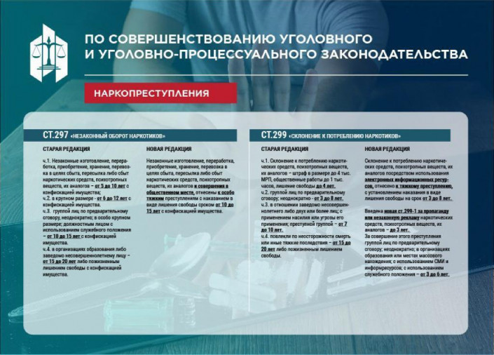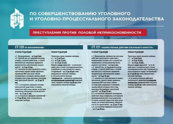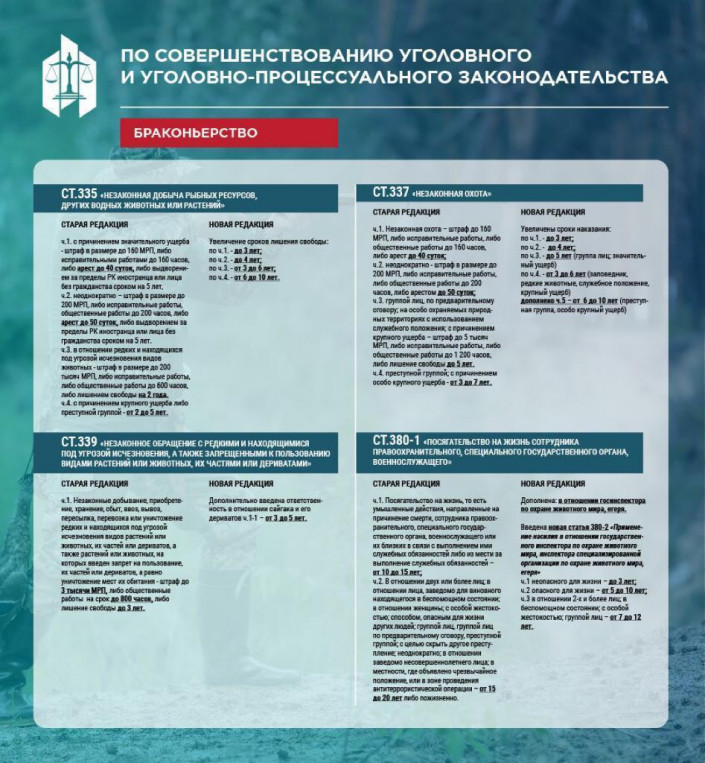 "В тот же день Мажилис рассмотрел новый законопроект, предусматривающий изменения в Уголовный и Уголовно-процессуальный кодекс, согласно которым вводятся новые меры ответственности за ряд преступлений. В частности, увеличиваются сроки за такие преступления, как изнасилование (статья 120), насильственные действия сексуального характера (статья 121), незаконный оборот наркотиков (статья 297), склонение к потреблению наркотиков (статья 299). Суровые меры приняты против браконьерства, также увеличены сроки лишения свободы по статье 335 – незаконная добыча рыбных ресурсов, по статье 337 – незаконная охота. Дополнительно введена ответственность в отношении незаконного добывания, уничтожения сайгаков и дериватов (статья 339). Ужесточается наказание за посягательство на жизнь госинспектора по охране животного мира (статья 390-1). Также ужесточается наказание за управление транспортным средством в состоянии алкогольного опьянения. Теперь лицо, ранее лишенное прав за пьяное вождение, за повторное нарушение может быть лишено прав пожизненно (статья 346). Увеличиваются сроки ареста за бытовое насилие против женщин (статья 73 КоАП). И вот 26 декабря Сенат принял новые поправки в Уголовный и Уголовно-процессуальный кодекс", - рассказал Карин.