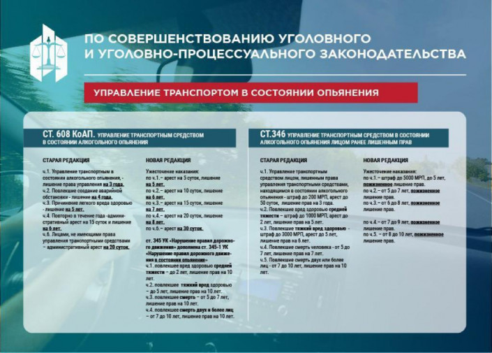 27 октября в Twitter Токаев также написал, что "поручил внести изменения в законодательство: ужесточить наказание за управление транспортными средствами после приема всех видов алкоголя, а также скотокрадство". По данным Карина, только за 10 месяцев 2019 года было выявлено 26 484 случая правонарушений, касающихся управления транспортным средством в состоянии опьянения, тогда как за аналогичный период 2018 года было выявлено 25 336 правонарушений.