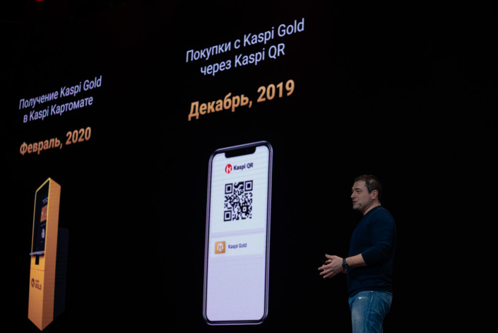 "Наша команда создала совершенно уникальный сервис, когда именная карта Kaspi Gold выпускается на ваших глазах всего за 60 секунд. Дизайн устройства и клиентского опыта сделан командой Kaspi.kz, и само устройство собрано в Казахстане. Мы назвали этот аппарат с любовью - "Kaspi Картомат", - сказал Михаил Ломтадзе и эффектно сдернул ткань с объекта на сцене. Этим объектом оказалось то самое уникальное устройство по производству именной карты Kaspi Gold в режиме реального времени.