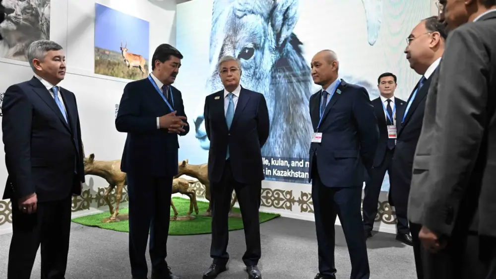 Затем Главе государства были представлены авторские скульптуры сайгаков, созданные художницей Гульфией Мельдеш, а также отечественная экологическая продукция.