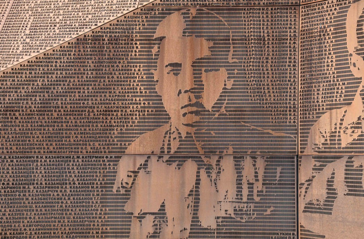 Скульптура солдата из бронзы высотой около 25 метров установлена на насыпном десятиметровом кургане. На стальных плитах увековечены имена защитников Отечества.