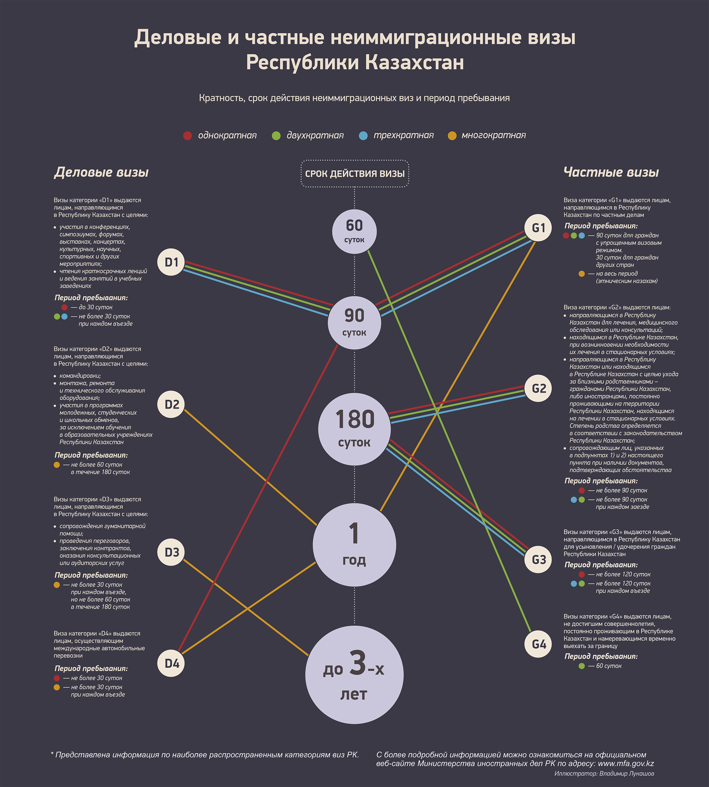 Информация по наиболее распространенным категориям виз Казахстана, а также о продлении и сокращении сроков их действия.