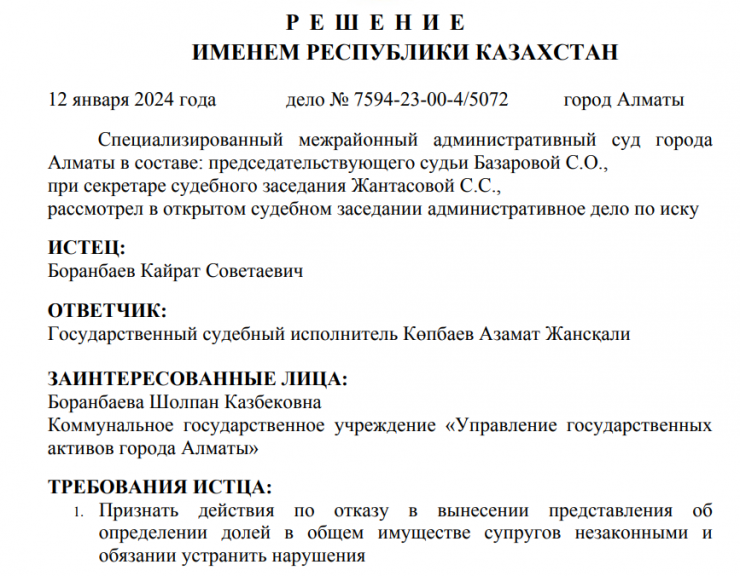 Как следует из судебных материалов, государственный судисполнитель отказался выносить представление об определении доли в общем имуществе Кайрата Боранбаева и его супруги Шолпан. Бизнесмен подал иск в суд, в котором потребовал признать такие действия незаконными и устранить нарушение его прав.