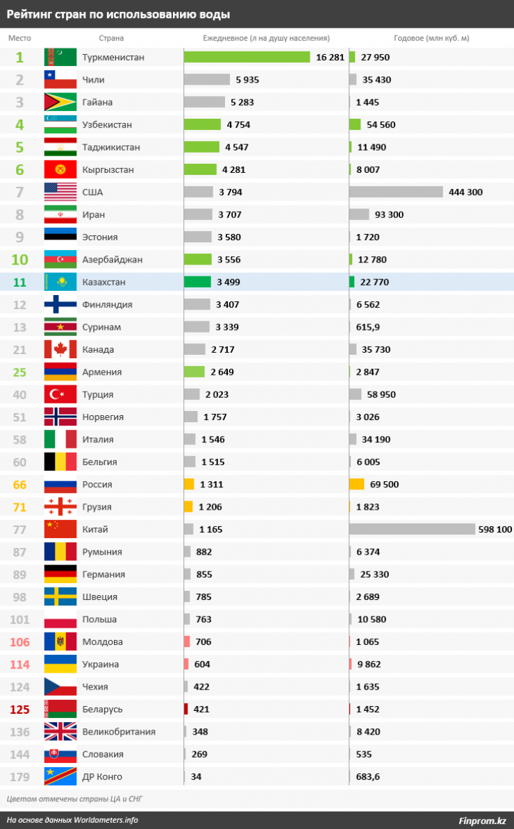 По данным справочного сайта Worldometers, Казахстан занял 11-е место по объему потребляемой воды на душу населения. Ежедневный уровень в стране составил 3,5 тысячи литров. Для сравнения, в России этот показатель в три раза меньше - 1,3 тысячи литров на человека, в Германии - 855 литров, а в Британии - всего 348 литров.