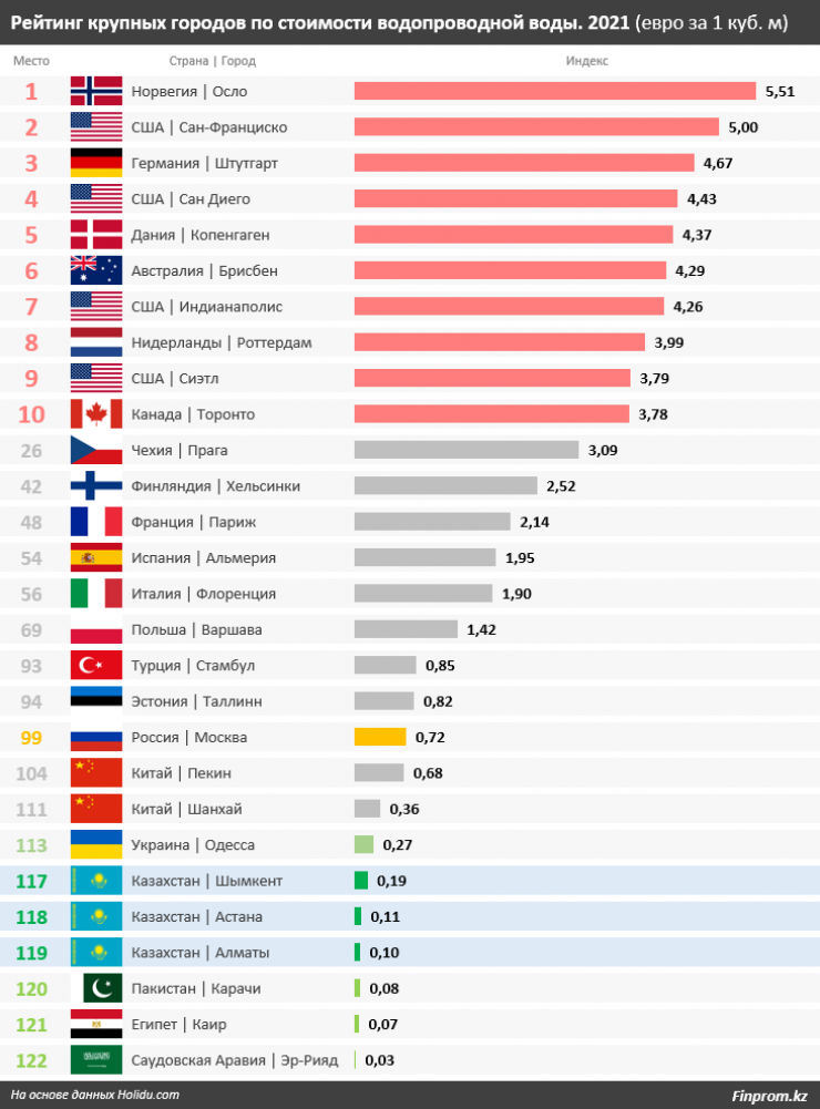 Самым дорогим среди 123 городов оказался норвежский Осло: здесь кубометр воды стоит 5,51 евро. Конечно, можно сказать, что зарплаты в Норвегии выше, чем в Казахстане, однако разница зарплат и тарифов оказывается несопоставимой. Чистая зарплата в Норвегии превышала зарплату в Казахстане в 7,7 раза. В то же время тарифы на водоснабжение в Осло превышали тарифы в Астане в 52 раза, а в Алматы - сразу в 58 раз.