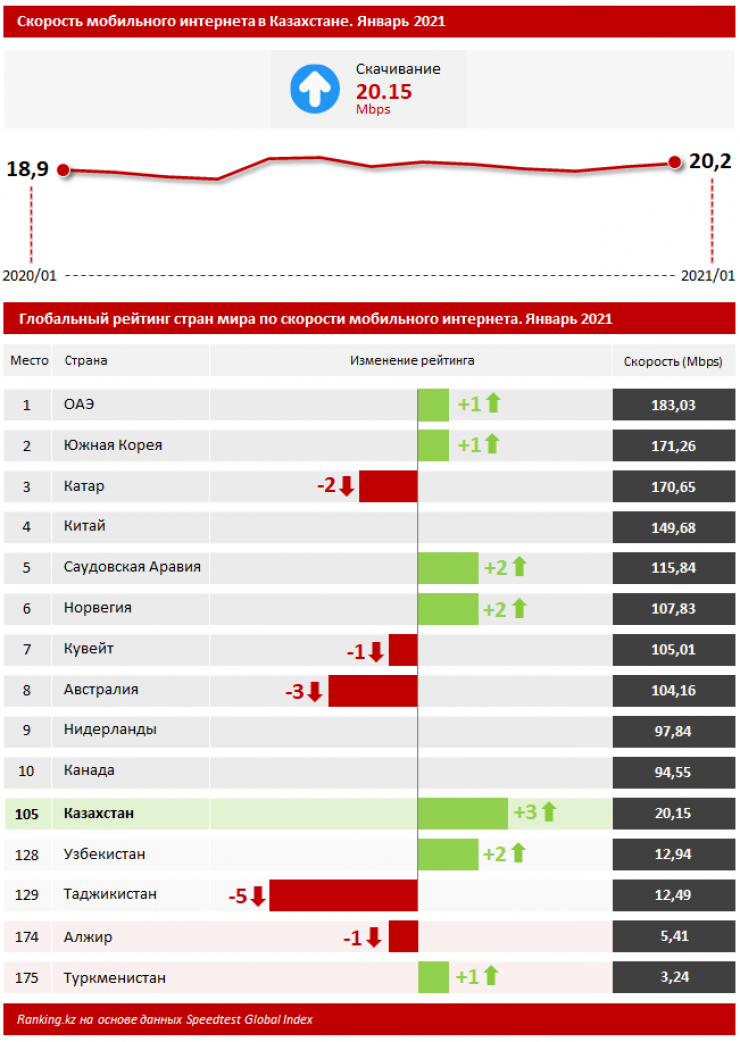 Казахстан в рейтинге занял 103-е место, улучшив свою позицию на три строчки. Страна вошла в топ-25 государств по росту в рейтинге. Скорость мобильного интернета в Казахстане увеличилась за год на 6,6 процента, до 20,15 мегабит в секунду. Отмечается, что Казахстан совместно с Кыргызстаном является лидером по скорости интернета среди стран Центральной Азии.