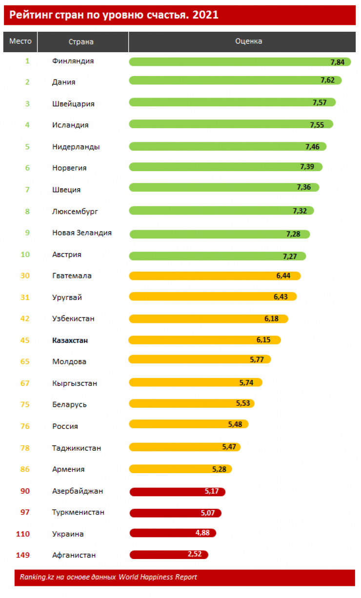 Казахстан занял 45-е место в международном рейтинге стран по уровню счастья (World Happiness Report). За год страна поднялась на пять позиций, передает корреспондент Tengrinews.kz со ссылкой на ranking.kz.