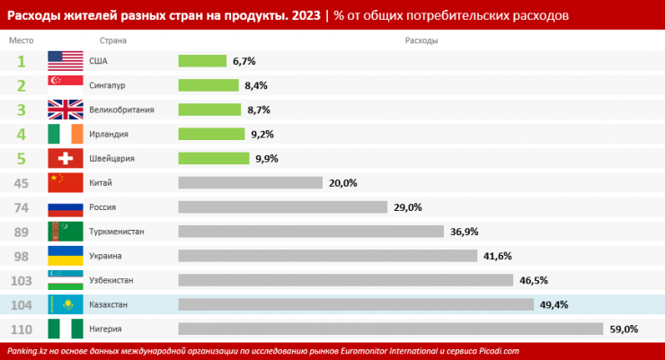Для сравнения, в США доля затрат на продовольствие составляет всего 6,7 процента, в большинстве европейских стран показатель колеблется в пределах 9-19 процентов. Даже в некоторых бедных странах Африки траты жителей на продовольствие меньше, чем у казахстанцев: в Уганде - 44,2 процента, в Камеруне - 45,2 процента, в Эфиопии - 41,3 процента.