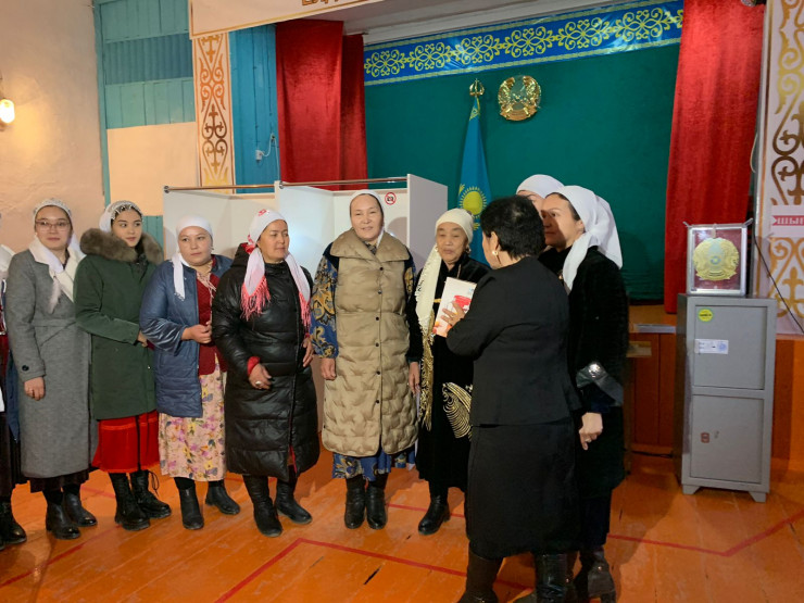 А это аул Актоган. Восемь келинок из семьи Сейтжановых одновременно посетили избирательный участок. И получили подарок за участие в важном событии.