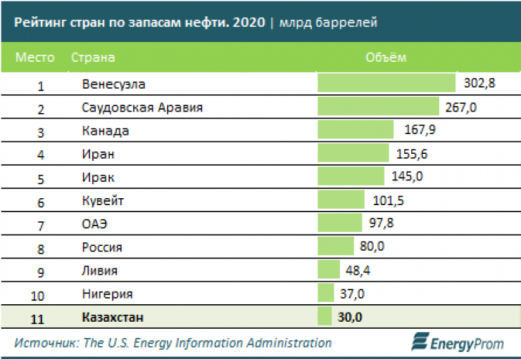Казахстан занял 11-е место в мире в рейтинге стран по запасам нефти с объемом в 30 миллиардов баррелей, сообщает Tengrinews.kz со ссылкой на EnergyProm.