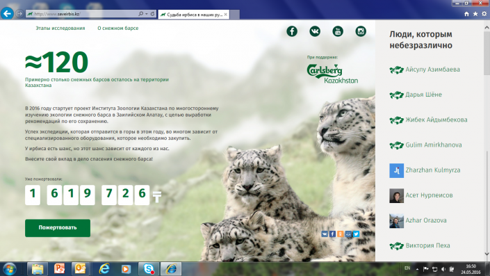 А в 2016 году в рамках проекта "Ирбис" Carlsberg Kazakhstan поддержал инициативу Института зоологии Казахстана по изучению снежного барса в Заилийском Алатау. На ее реализацию необходимо собрать более 6 миллионов тенге. Для этого был запущен краудфандинговый портал, через который представители компании и исследователи обращаются ко всем неравнодушным, готовым внести свой вклад в успешную реализацию этого социального проекта по сохранению ирбиса - символа гор Центральной Азии и Казахстана.
