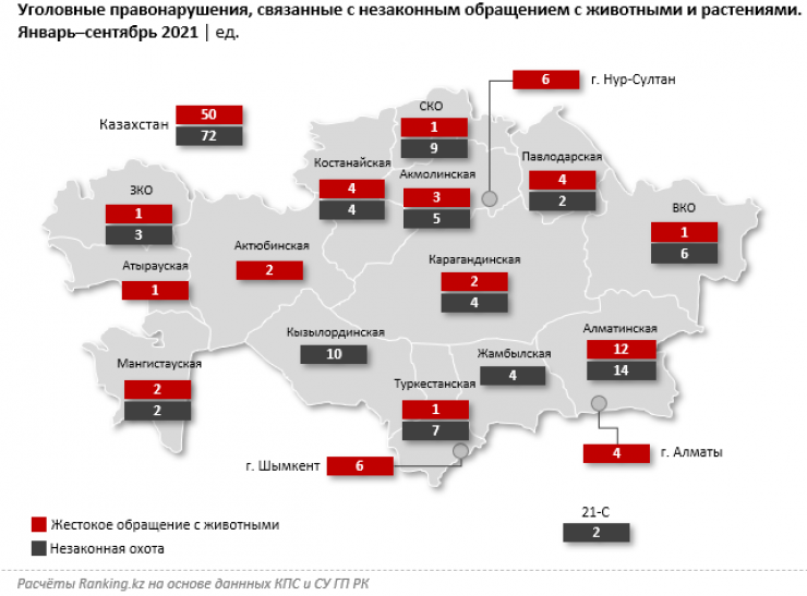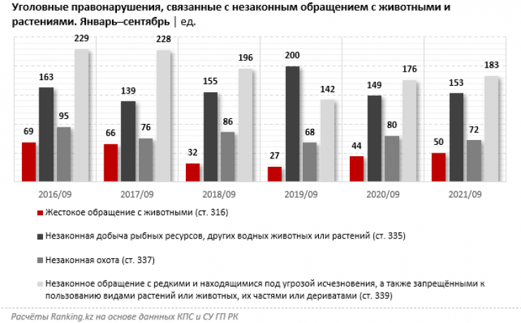 С января по сентябрь 2021 года число уголовных правонарушений, связанных с незаконным обращением с животными, возросло, передает корреспондент Tengrinews.kz со ссылкой на ranking.kz.