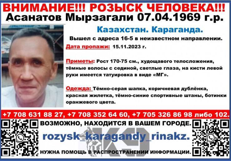 "Он ростом 173 сантиметра, худощавого телосложения, волосы темные с сединой, глаза зеленые. Был одет в серую футболку, красную кофту, теплые спортивные штаны черного цвета, рыжие ботинки, облегченную дубленку. Имеет татуировку на запястье с инициалами "МГ". Всем, кто что-либо знает о нем, просьба звонить по номерам: +77753799509, +77029049502 или +77754698297", - добавила супруга пропавшего.
