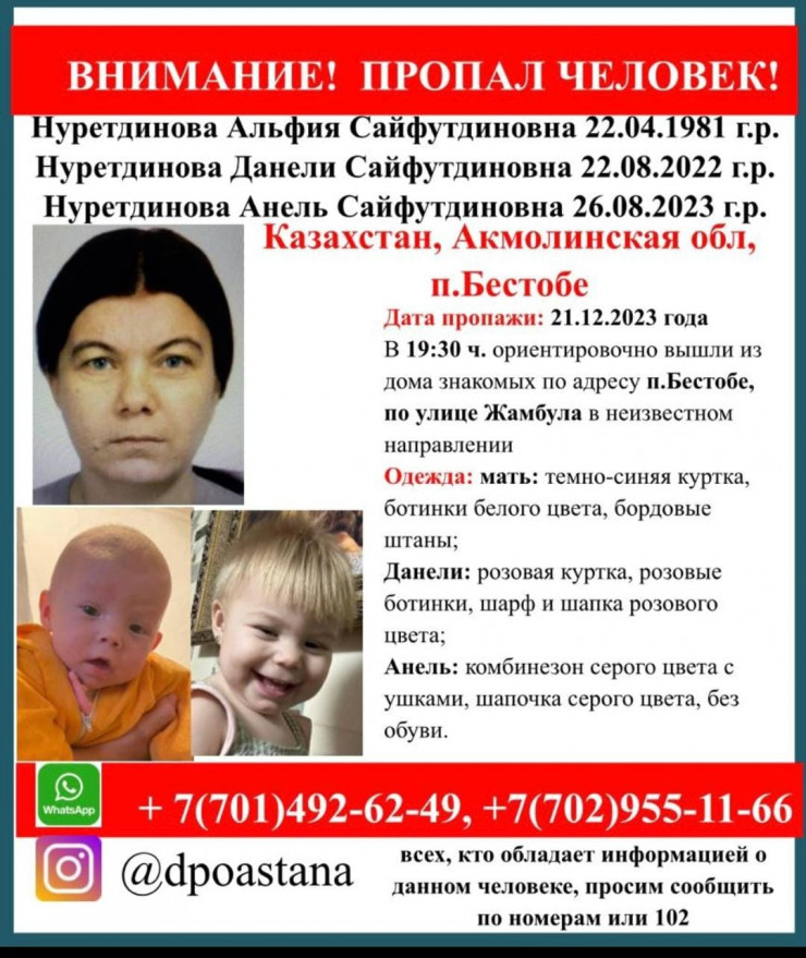 21 декабря в отдел полиции поселка Бестобе управления полиции Степногорска поступило сообщение от местной жительницы с просьбой оказать содействие в поиске 42-летней Альфии Нуретдиновой и двух ее маленьких детей 2022 и 2023 года рождения.