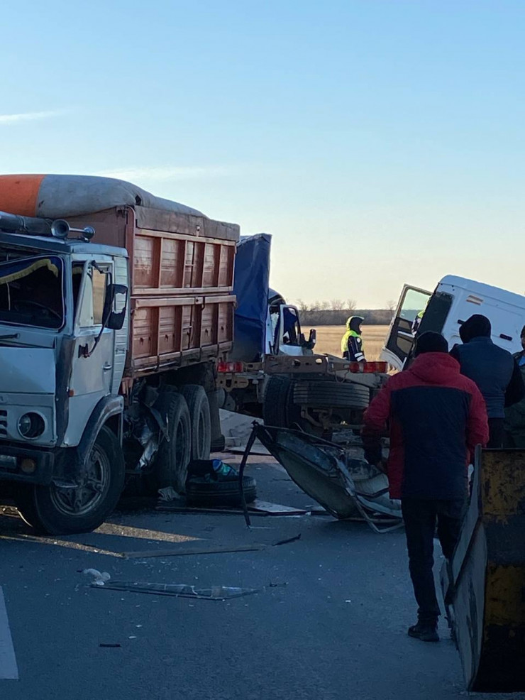 "Предварительно установлено, что водитель КамАЗа врезался в стоящую "Газель", после чего та вылетела на встречную полосу и столкнулась грузовиком Howo. КамАЗ после столкновения с "Газелью" врезался в грузовик Mercedes с полуприцепом", - сообщили в ведомстве.