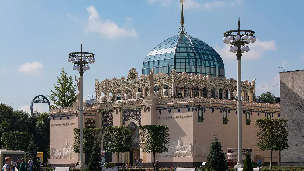 Павильон "Казахстан" на ВДНХ открылся в конце 2021 года после масштабной реставрации. Ему был возвращен исторический облик середины ХХ века. В декабре проект стал лауреатом конкурса "Московская реставрация - 2021" правительства Москвы, а в июле был удостоен Золотого знака ВДНХ за вклад в реставрацию и активную интеграцию в событийную повестку.