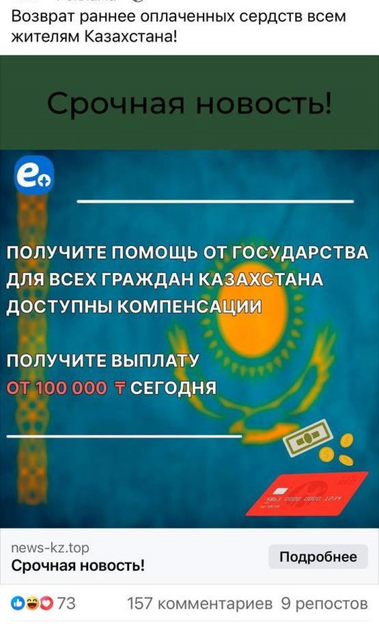 В соцсетях появилась реклама, в которой каждому казахстанцу обещают "помощь от государства" в размере 100 тысяч тенге и больше. В StopFake.kz предупредили, что это фейк, передает Tengrinews.kz.
