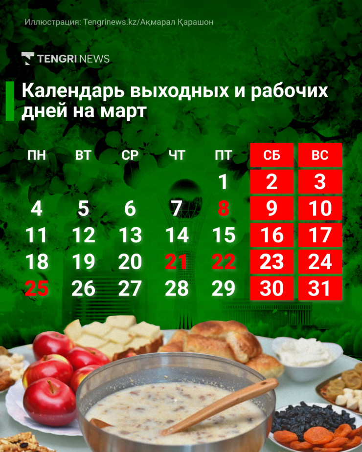 В 2024 году 8 марта выпало на пятницу. Поэтому казахстанцы, работающие по пятидневной рабочей неделе, отдохнут три дня подряд - 8, 9 и 10 марта (с пятницу по воскресенье).