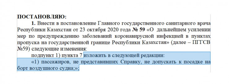 Документом предписывается не допускать к посадке на борт воздушного судна пассажиров, не представивших справку с отрицательным результатом теста на COVID-19 методом ПЦР. Отметим, что речь идет об авиарейсах из-за рубежа в Казахстан.