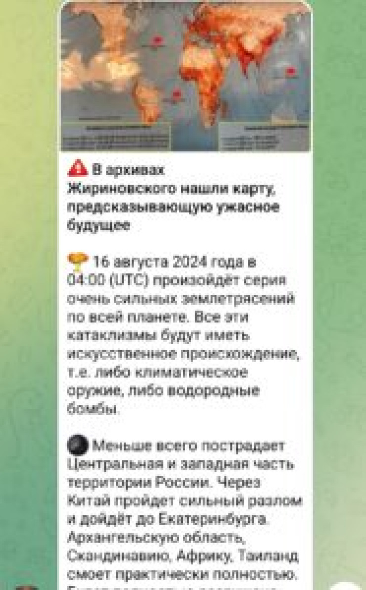 Ранее в одном из Telegram-каналов появилась новость о том, что по всей планете 16 августа в 04:00 произойдут сильные землетрясения. Якобы информация об этом есть в картах, которые обнаружены в архивах российского политика Владимира Жириновского.
