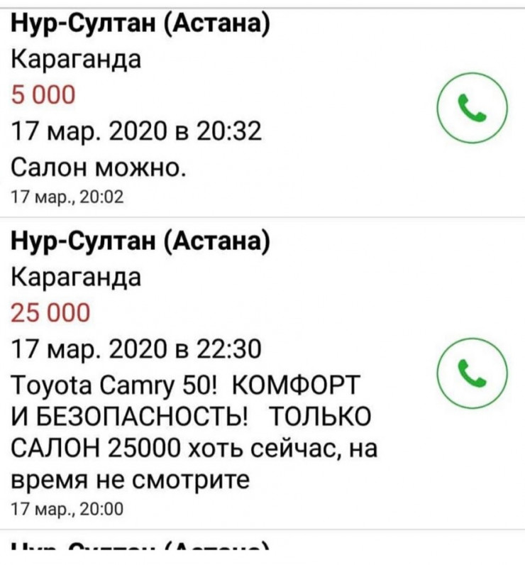"Раньше в будние дни такси в inDriver можно было заказать до Караганды за 2 500 тенге максимум, а в выходные – 3 500 тенге. Но вчера я уехала за пять тысяч тенге. Салон стоил около 20-30 тысяч тенге. Когда я спросила водителя, почему такие цены, он ответил, что он не живет в Караганде, а просто выехал подзаработать, узнав о происходящем", - рассказывает жительница столицы.