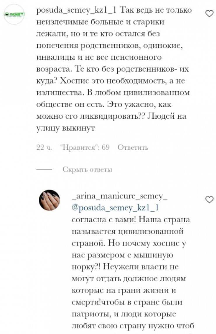 "Информация о закрытии хосписа недостоверная. Видимо, люди перепутали с первой волной коронавируса, когда мы действительно закрывались и наше здание было передано инфекционной больнице. Но на сегодняшний день мы продолжаем функционировать", - сообщила главный врач хосписа города Семея Галия Жуасбаева.