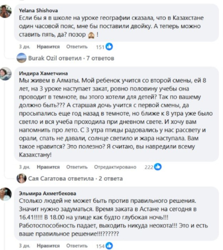 "Единственно научно-обоснованный аргумент должен быть такой - максимально рациональное использование солнечного света!!!! Для этого в Алматы необходимо переводить стрелки не на час, а на два часа вперед, что бы максимально приблизить время пробуждения людей к восходу солнца, а отход ко сну - к закату. Это 6 утра и 21:30 - 22:00 вечера. Только в этом случае люди будут спать в темноте, а работать и успевать заниматься домашними делами или проводить время с детьми на открытом воздухе при естественном освещении", - прокомментировал читатель.