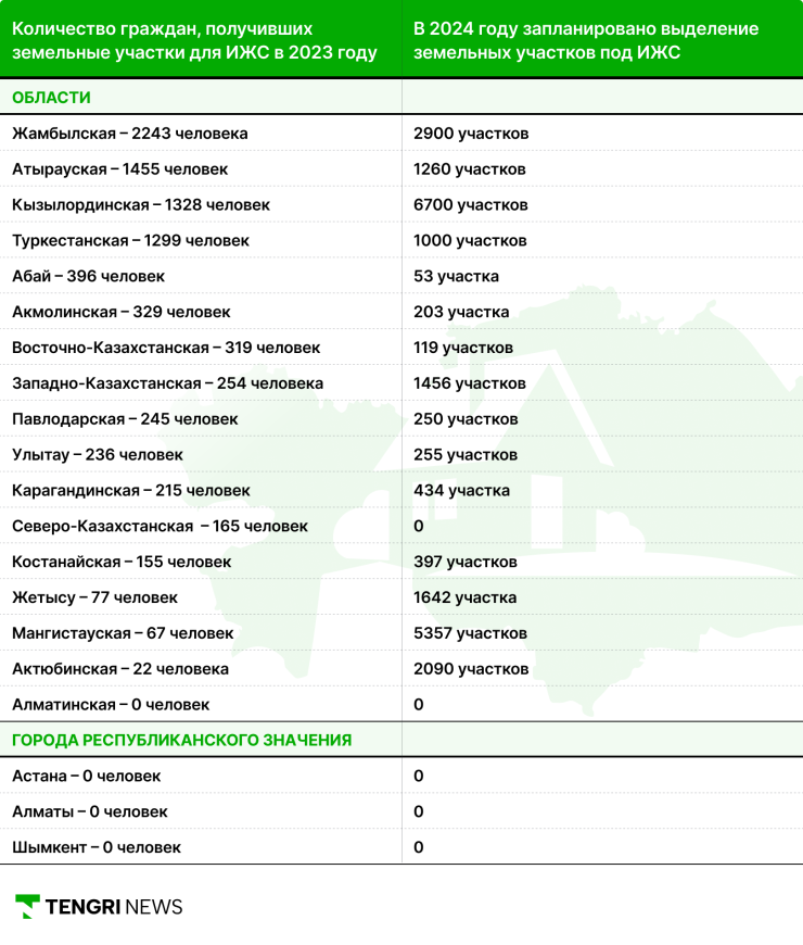 По данным ведомства, в прошлом году больше всего граждан получило участки под ИЖС в Жамбылской области - 2243 человека. Меньше всего - 22 человека - в Актюбинской области. При этом в одном из регионов и в трех городах республиканского значения не было выдано ни одного участка.