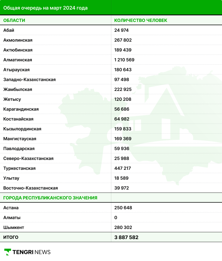 При этом очередь по стране достаточно большая и увеличивается с каждым годом. По информации комитета, согласно данным на март 2024 года, только в Алматинской области свои 10 соток ждут 1 210 569 человек. А вот Алматы является единственным городом, где нет ни одного желающего получить земельный участок. Судя по всему, здесь попросту не принимают заявки от граждан. При этом в комитете отметили, что "мораторий на выдачу земельных участков под ИЖС в населенных пунктах не устанавливался".