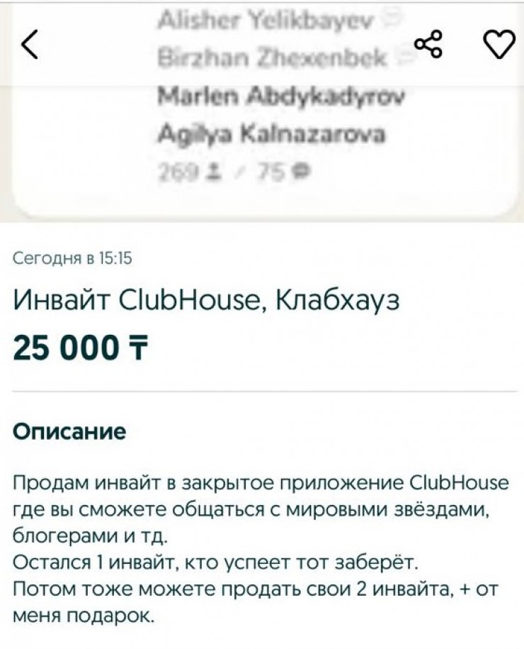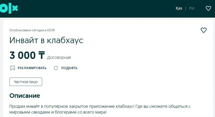 Объявления о продаже приглашения в новую социальную сеть Clubhouse стали появляться в сервисе OLX. Казахстанцы пишут, что продадут инвайты в закрытое приложение, где можно пообщаться с мировыми звездами. Цена на одно приглашение составляет от тысячи до 25 тысяч тенге.