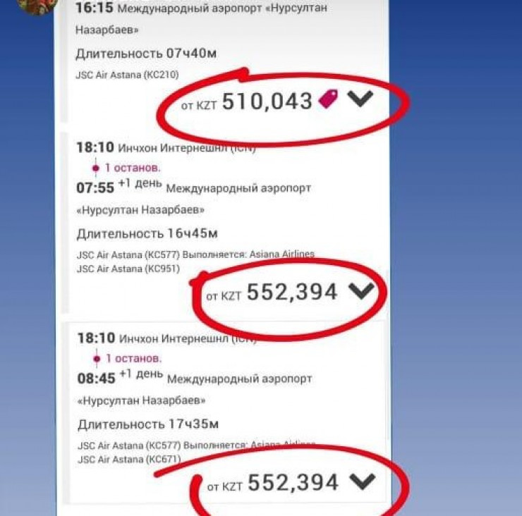 "Данный скриншот сделан не с нашего сайта, а с агрегатора, поэтому цена такая высокая. На нашем официальном сайте билеты из Сеула в Алматы можно купить на ближайшие дни за 237 тысяч, а в Нур-Султан - от 232 тысяч. Это выше обычного, но вы знаете, что сейчас у нас осталось всего по одному рейсу в неделю в эти города из Южной Кореи. Провозные емкости сократились между Сеулом и Нур-Султаном на 50 процентов, а между Сеулом и Алматы - на 80 процентов", - сообщил менеджер по корпоративным коммуникациям компании Тлек Абдрахимов.