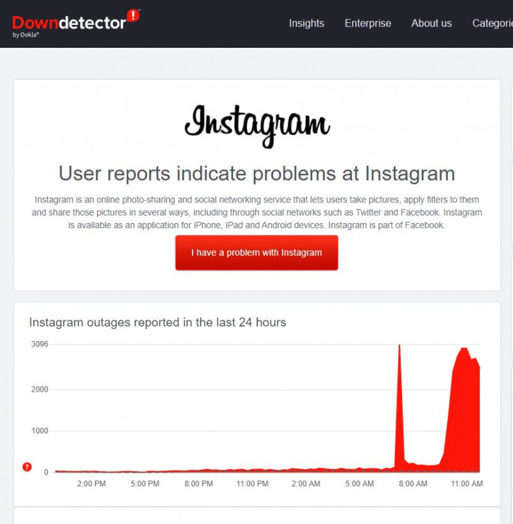 По данным Downdetector, на проблемы в работе Instagram поступило больше трех тысяч жалоб по всему миру.