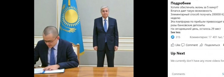 "Первое, на что следует обратить внимание, - размещение не на официальном ресурсе и не в аккаунте криптобиржи Binance, а на посторонней странице. Второе - новостной выпуск, в котором говорят о встрече Касым-Жомарта Токаева с Чанпеном Чжао, обрывается на том моменте, когда ведущая начинает озвучивать предмет их беседы. Тогда голос за кадром меняется на мужской и подробно рассказывает о том, какие условия ждут казахстанцев на криптобирже", - говорится в сообщении.