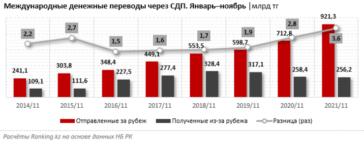 "В разрезе стран по объему отправленных из страны денежных переводов с января по ноябрь 2021 года лидируют Узбекистан (278,5 миллиарда тенге), Турция (189,2 миллиарда тенге) и Россия (162,1 миллиарда тенге), на которые совокупно приходится более двух третей объема", - уточнили в Ranking.kz.