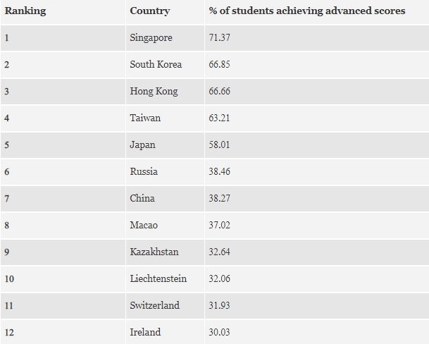 Казахстан не вошел в основной рейтинг, но занял девятое место среди всех государств мира по достижениями школьников, опередив Великобританию, Израиль, Швейцарию и другие страны. Этот результат авторы рейтинга назвали сюрпризом.