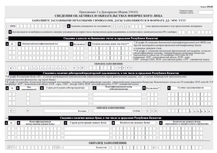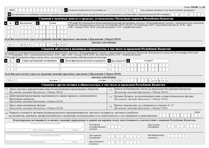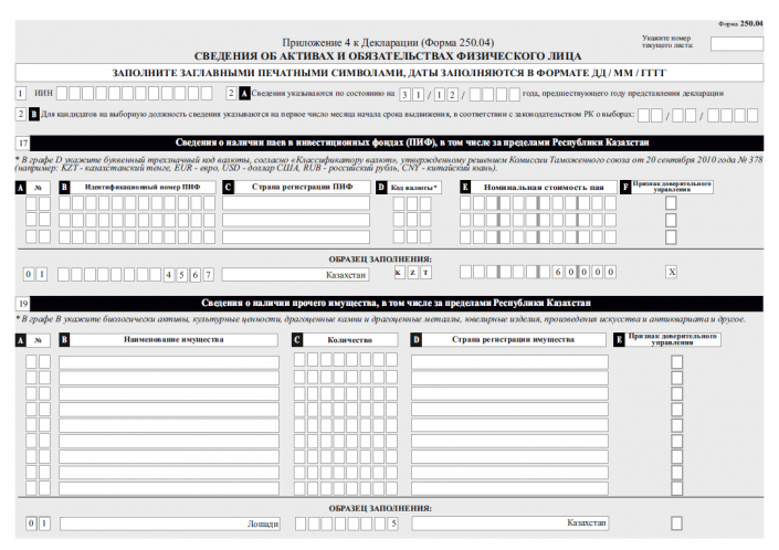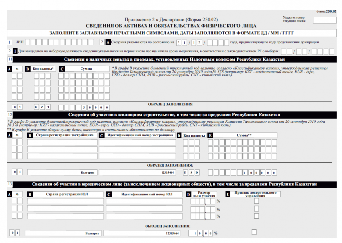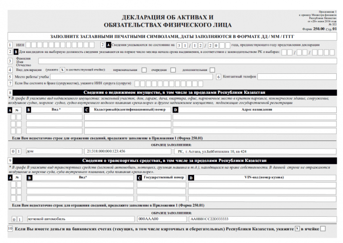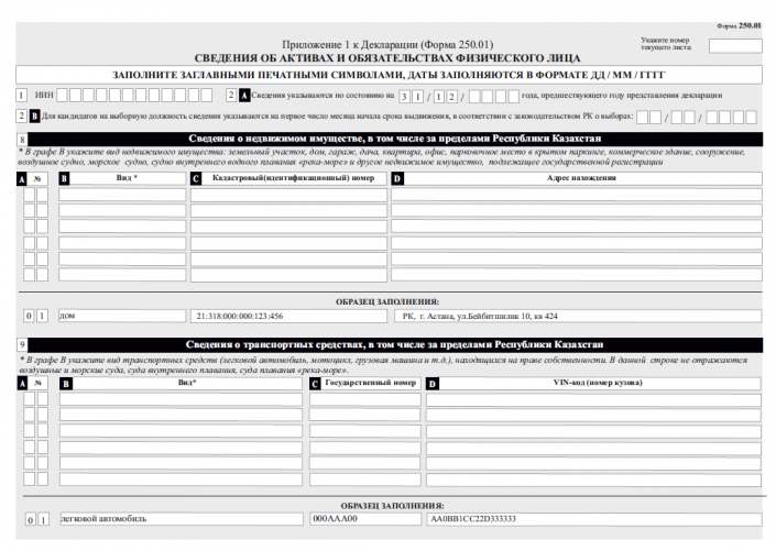 К примеру, в графе  9 "Сведения о транспортных средствах, в том числе за пределами Республики Казахстан" указывается вид транспорта (легковая, грузовая и прочее), госномер и VIN-код.