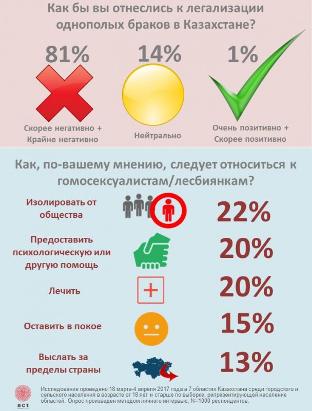 Подавляющее большинство казахстанцев (81 процент) высказывается против легализации однополых браков. Только 1 процент опрошенных считает, что можно разрешить такие браки.