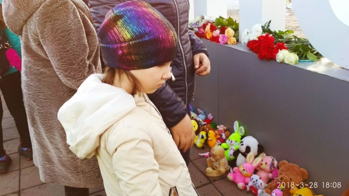 Павлодарка Марина пришла почтить память маленьких кемеровчан вместе с 4 и 6- летними дочерьми. Женщина крепко держит девочек за руки. "Теперь только так, никаких развлекательных центров и шопингов. Только на прогулку и домой. Очень страшно. Искренне сочувствую кемеровчанам", - сказала женщина.