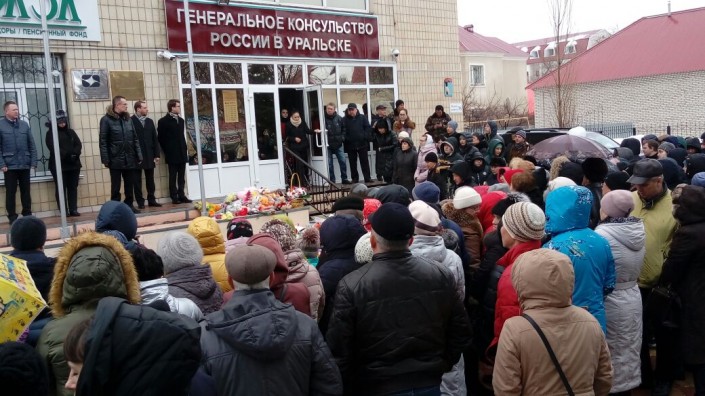 В Уральске сотни людей собрались у здания Генерального консульства России. Люди несли сюда цветы, воздушные шары черного цвета, мягкие игрушки. Перед собравшимися выступил Генеральный консул России в Уральске. Он отметил, что весь день 28 марта люди смогут прийти сюда для того, чтобы почтить память погибших.