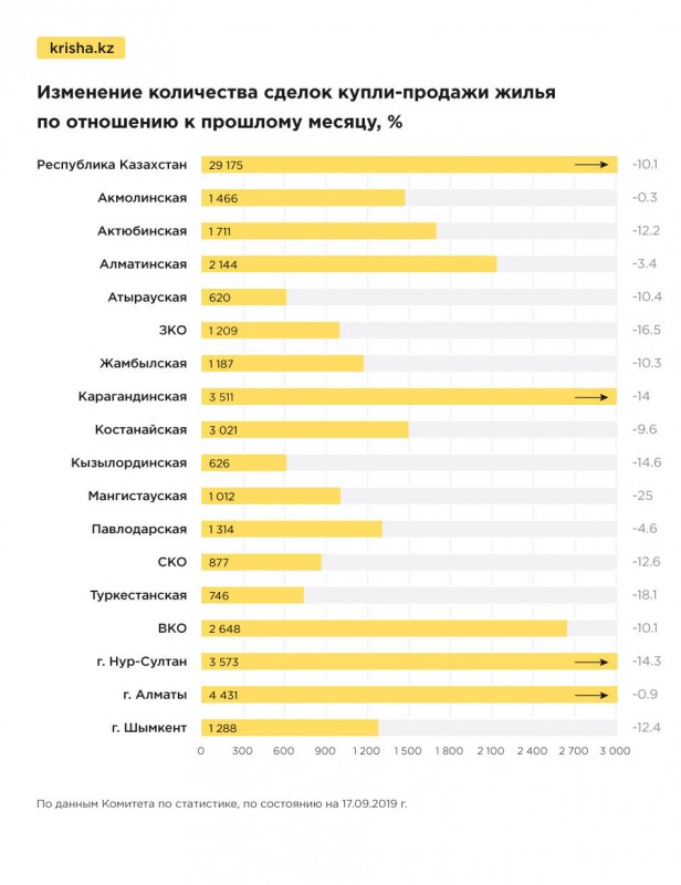 Что касается изменений за месяц, то в августе по сравнению с июлем количество сделок снизилось в Казахстане на 10,1 процента и составило 29 175 единиц. Наибольшее снижение зафиксировано в Мангистауской (-25 процентов), Туркестанской (-18,1 процента) и Западно-Казахстанской (-16,5 процента) областях.