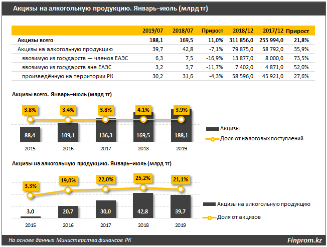 В разные годы Комитет по статистике и прочие аналитики оценивали долю нелегального алкоголя на рынке от 20 до 50 процентов. Теневой рынок серьезно подрывает налогообложение в секторе. Так, при доле нелегального алкоголя в 20 процентов акцизы в секторе могли бы составить за те же 7 месяцев текущего года уже 49,7 миллиарда тенге, а при доле в 50 процентов - 79,5 миллиарда. Таким образом, недобор по акцизам может составлять от 17 до 68 миллиардов тенге в год.