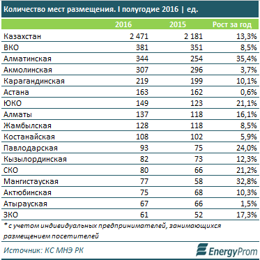 Тем временем в Казахстане увеличивается и количество мест, где туристы могли бы отдохнуть. Свои услуги казахстанцам и гостям страны готовы предоставить 2,5 тысячи мест размещения туристов. Это на 13,3 процента больше, чем годом ранее. Наибольшее количество гостиниц, мотелей, кемпингов, туристских баз и прочих гостевых домов сосредоточено в ВКО. Здесь находятся 381 место размещения, что на 8,5 процента больше, чем за 2015 год. На втором месте расположилась Алматинская область с 344 местами размещения (+35,4 процента - самый значительный показатель годового прироста). А на третьем места Акмолинской области с 307 местами размещения (+3,7 процента).