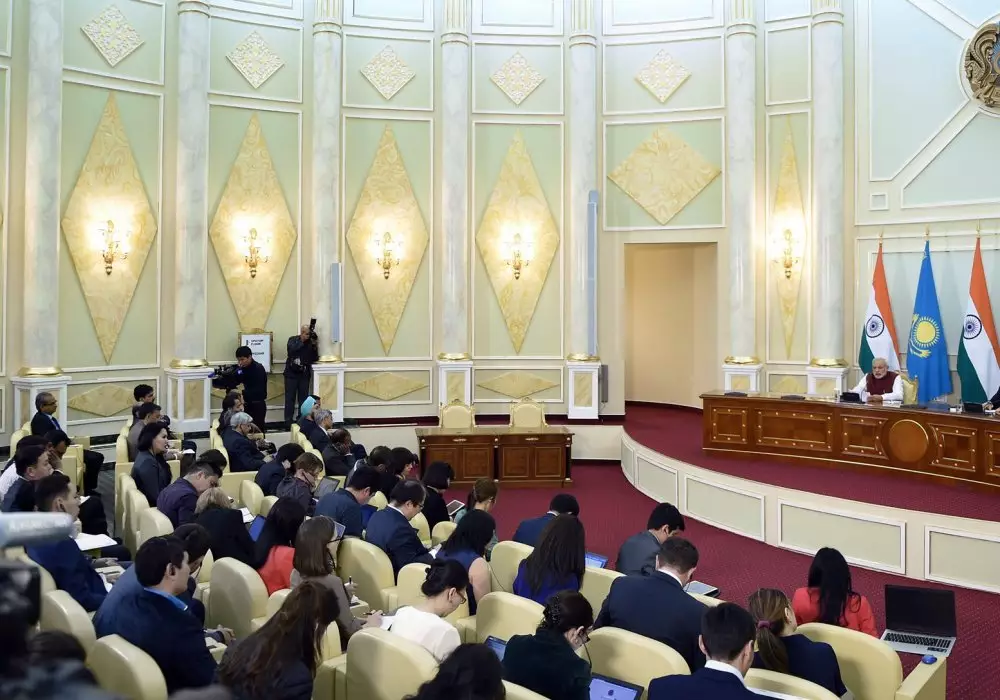 "Я прилетел вчера и уже много узнал. На таком высоком уровне вы оказали нам прием, это честь и для меня, и для всего народа Индии. (...) Ваша страна имеет такое маленькое народонаселение, можно сказать, что народонаселение всего Казахстана меньше даже какого-либо города Индии. Но несмотря на это и на то, что совсем рядом с вами находятся такие державы, как Россия и Китай, среди таких условий ярко видно ваше умелое руководство, ваше видение, вашу приверженность к тому, чтобы развивать свое государство. Сегодня Казахстан развивается как очень успешная экономика. Все это благодаря вашему мышлению, планированию. Индия, несмотря на то, что это большая страна, многому у вас может поучиться", - сказал Нарендра Моди. Нурсултан Назарбаев в свою очередь отметил, что Казахстан и Индия имеют схожую международную повестку дня, большой потенциал в торгово-экономической сфере, а многовековая дружба, культурно-исторические связи делают две страны близкими по духу, братскими народами.